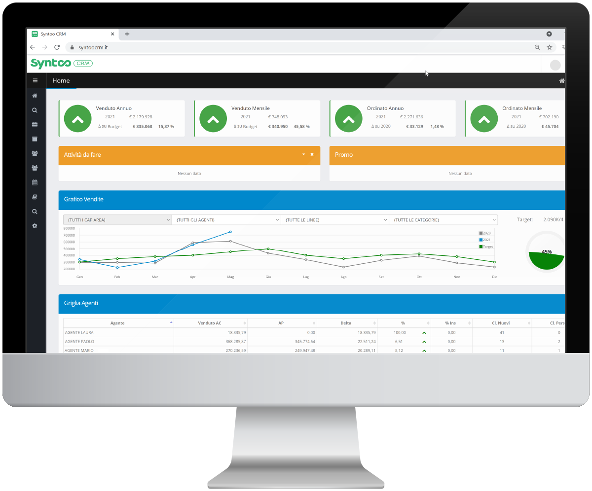 Syntoo CRM è uno strumento fondamentale per migliorare l'efficienza aziendale, centralizzare i dati dei clienti e ottimizzare i processi di vendita, marketing e assistenza. Grazie Syntoo CRM, puoi automatizzare le attività, migliorare la comunicazione interna, analizzare i dati in tempo reale e prendere decisioni strategiche più rapidamente. È uno strumento che supporta la crescita, aiutando la tua azienda a fornire un servizio clienti superiore e a sviluppare nuove opportunità di mercato.